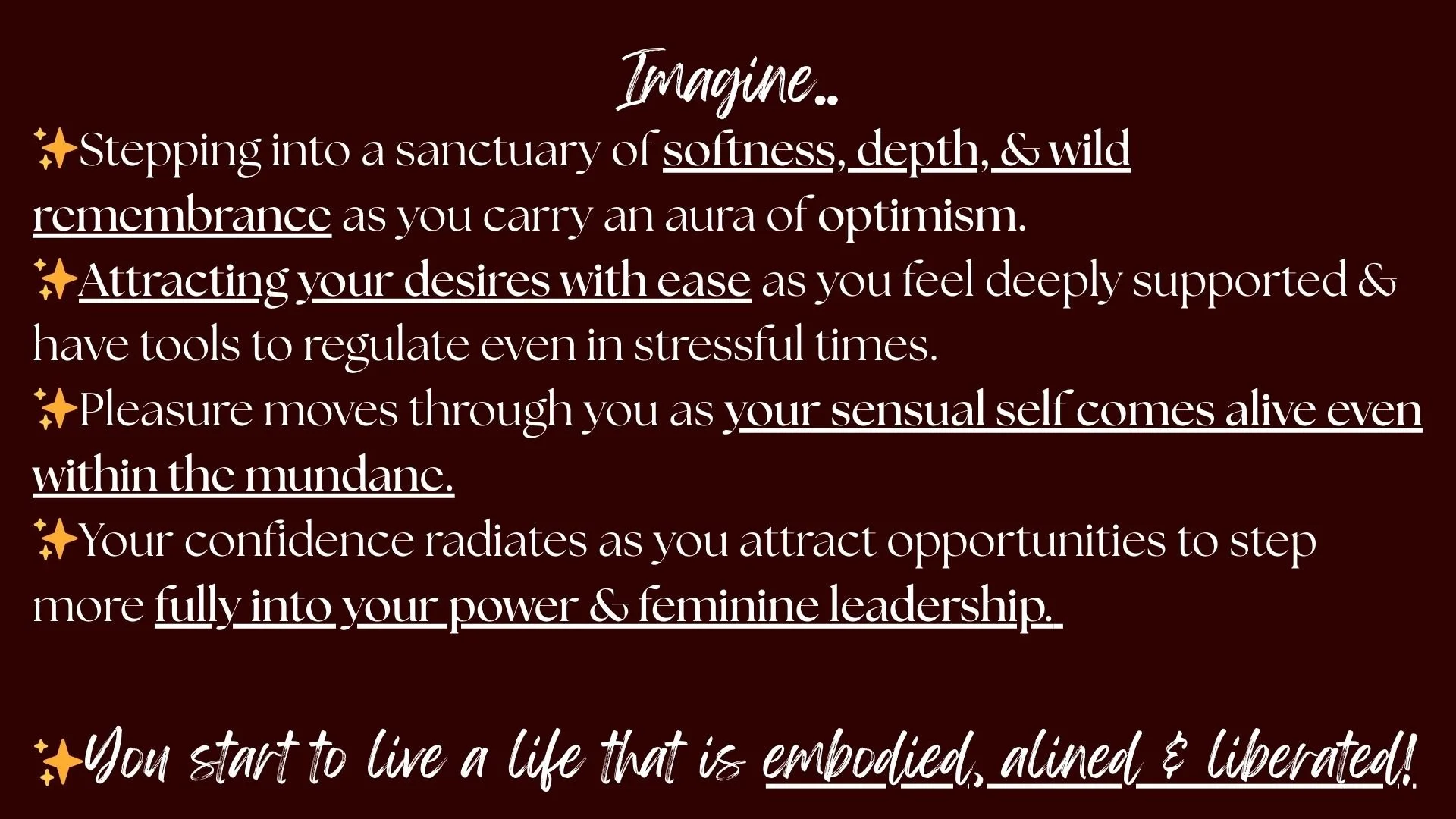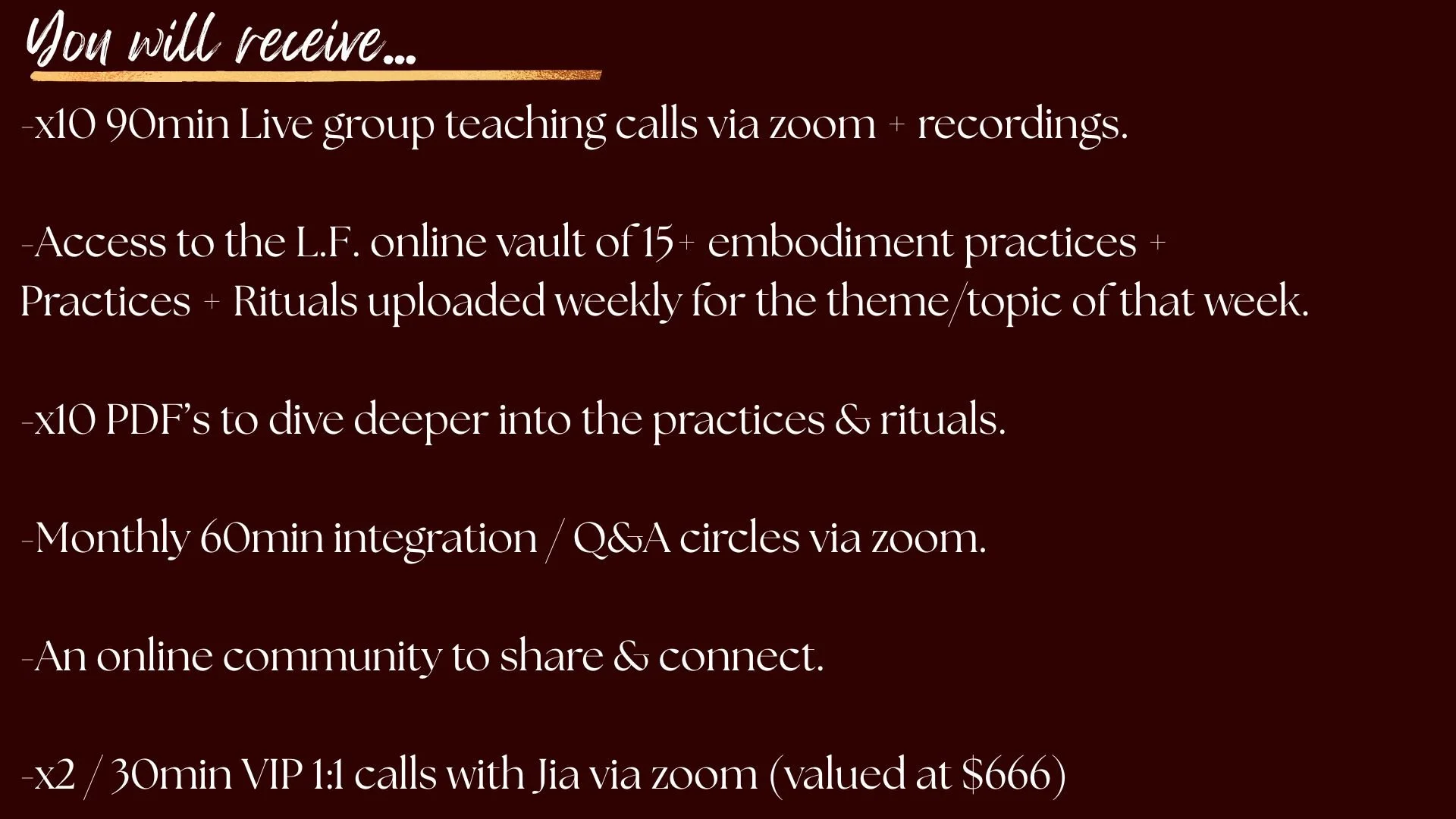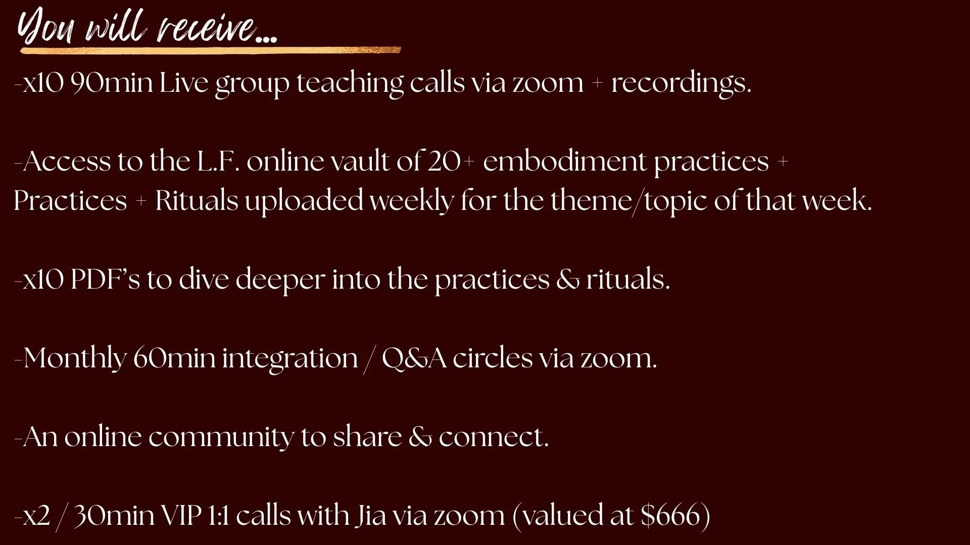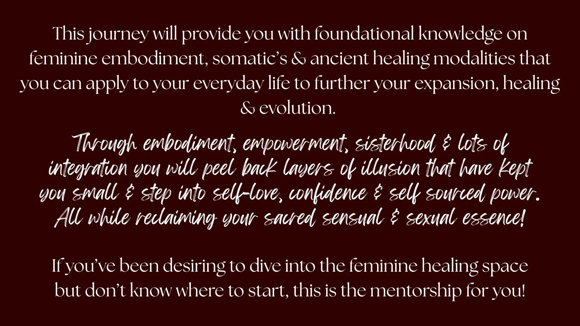 The online portal includes recordings of all live calls, guided embodiment practices, meditations, rituals, supporting materials, with new content uploaded weekly related to the theme of that week. You will also have access to the Liberated Feminine Skool community where you can share your wins & desires!