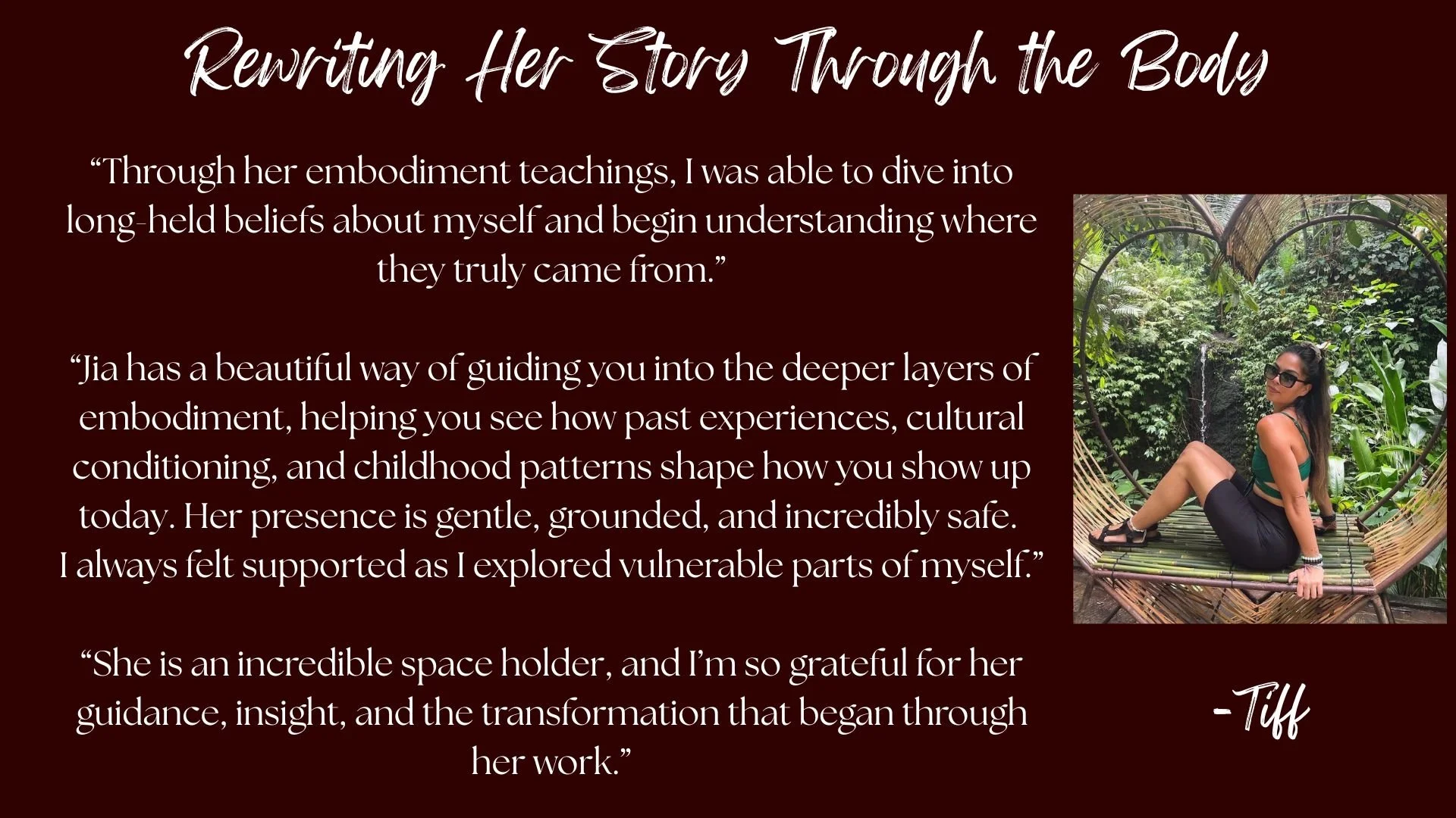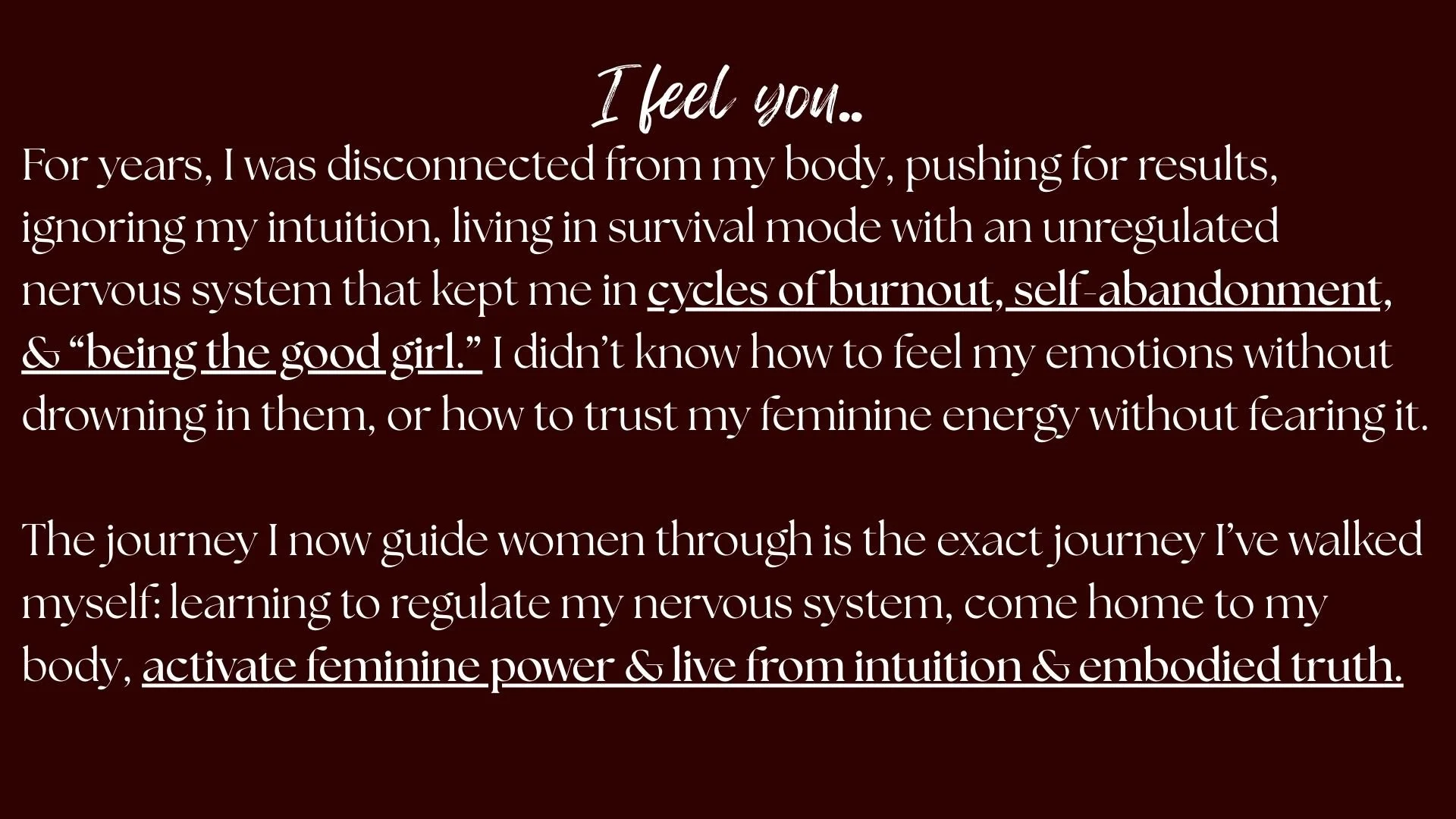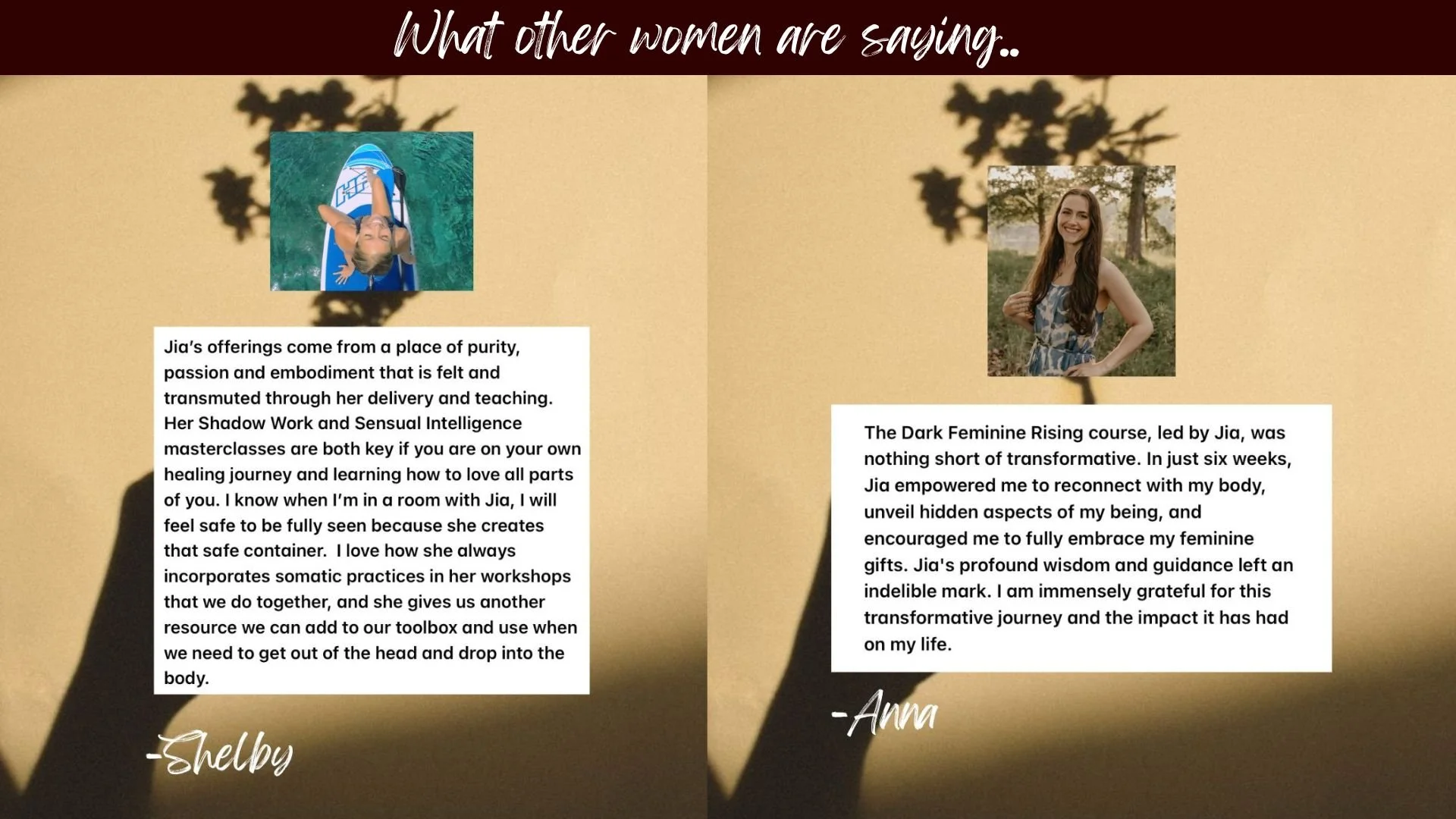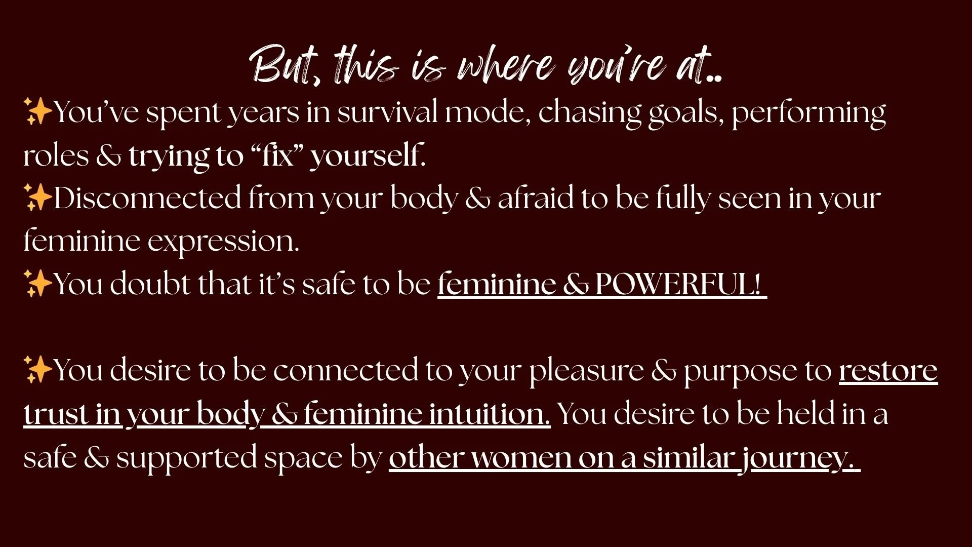 The online portal includes recordings of all live calls, guided embodiment practices, meditations, rituals, supporting materials, with new content uploaded weekly related to the theme of that week. You will also have access to the Liberated Feminine Skool community where you can share your wins & desires!